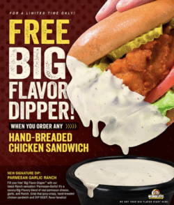 The “Free Big Flavor Dipper with any Hand-Breaded Chicken Sandwich” offer will be available systemwide starting October 28. As a stand-alone purchase, the Wings Etc. 5.5-ounce Big Flavor Dipper is available for $2.99.