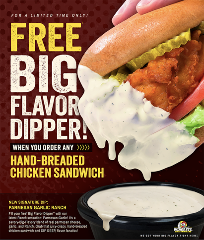 During the promotion, every hand-breaded chicken sandwich order includes a free Big Flavor Dipper, with a choice of dip, allowing guests to customize their “Big Flavor” experience. As part of the promotion, Wings Etc. is featuring a new, limited-time dipping sauce: Parmesan-Garlic Ranch.